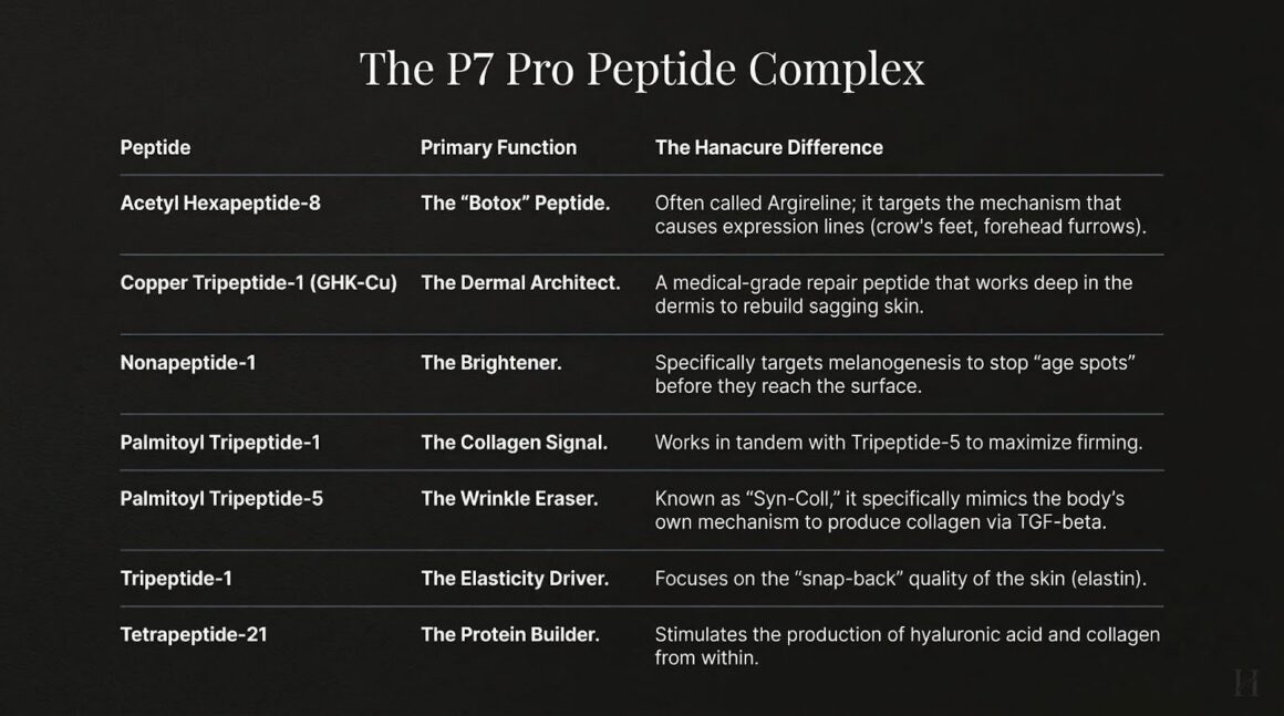 Hanacure didn’t just throw a trendy “peptide blend” into a moisturizer; they selected 7 highly potent, medical-grade peptides designed to mimic professional dermatological treatments. While other brands focus on basic proteins for hydration, Hanacure focuses on deep-tissue architectural repair.